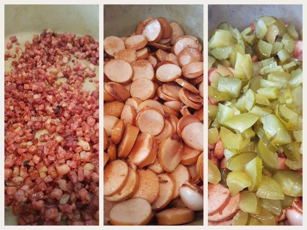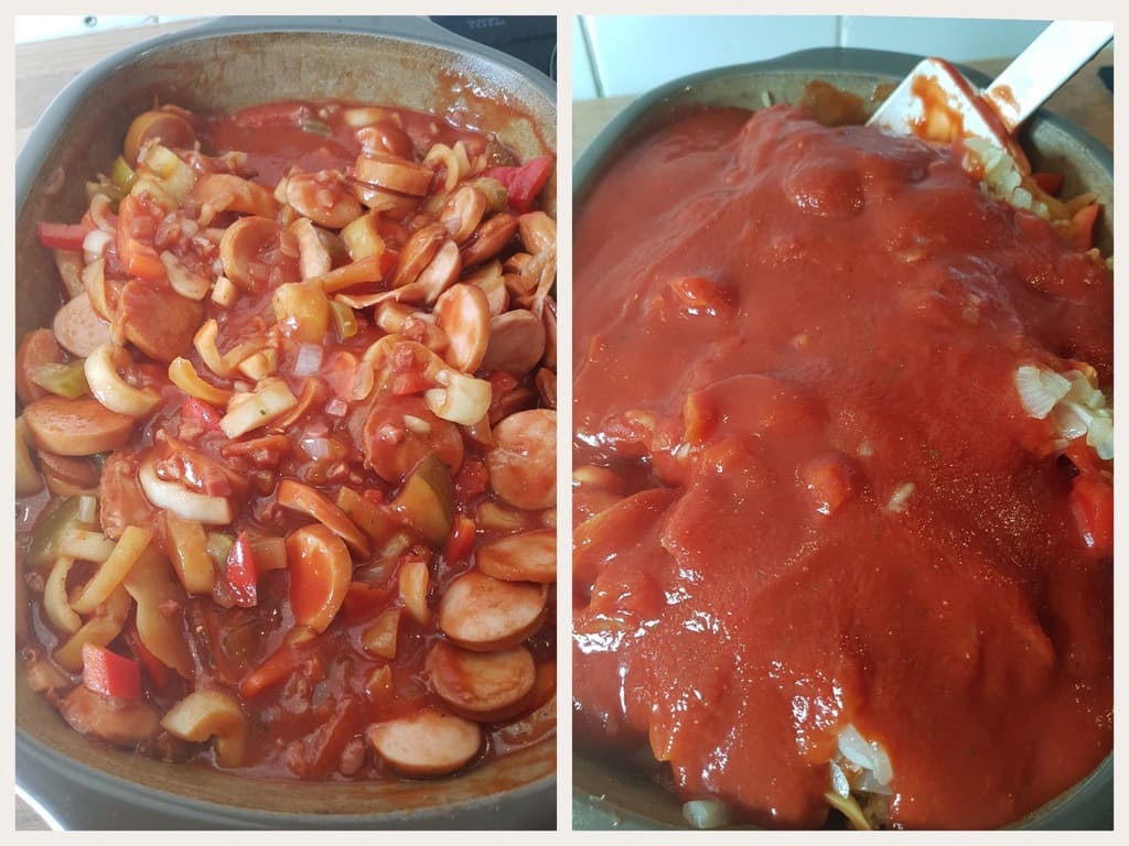 Bockwurst in Scheiben schneiden, in einer Pfanne scharf anbraten und in den Ofenmeister geben.