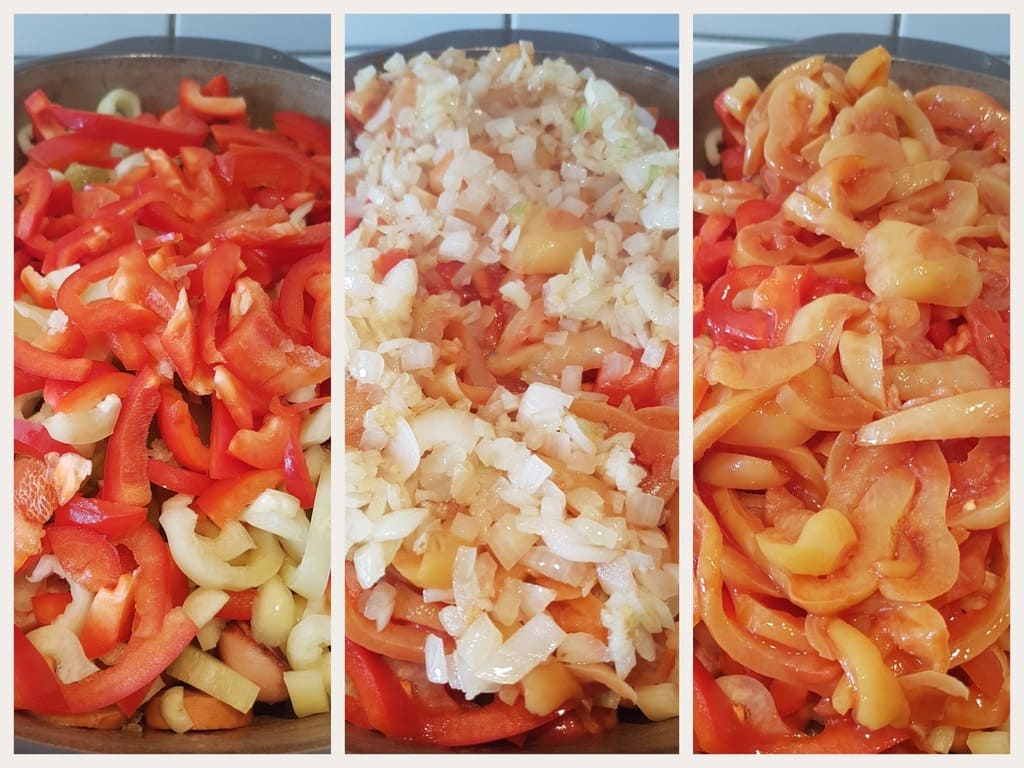 Zwiebeln grob in Stückchen schneiden, den Knoblauch pressen alles in der Pfanne anbraten und in den Ofenmeister geben.