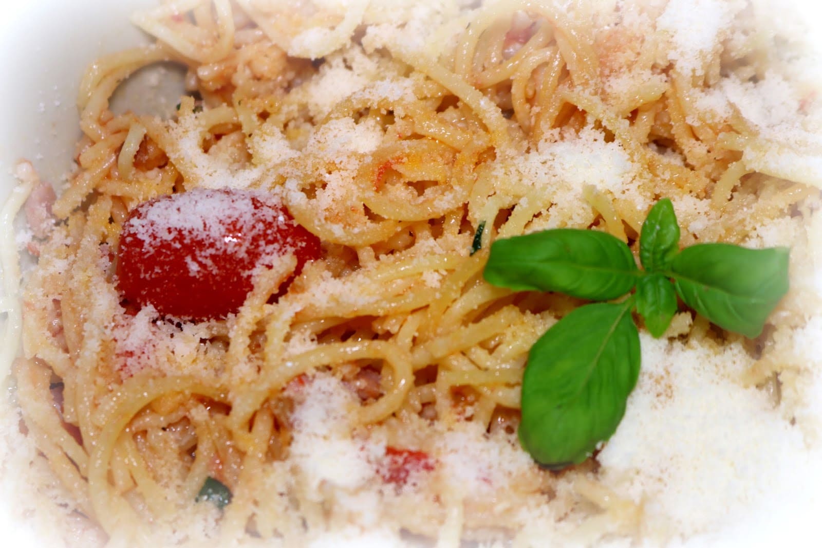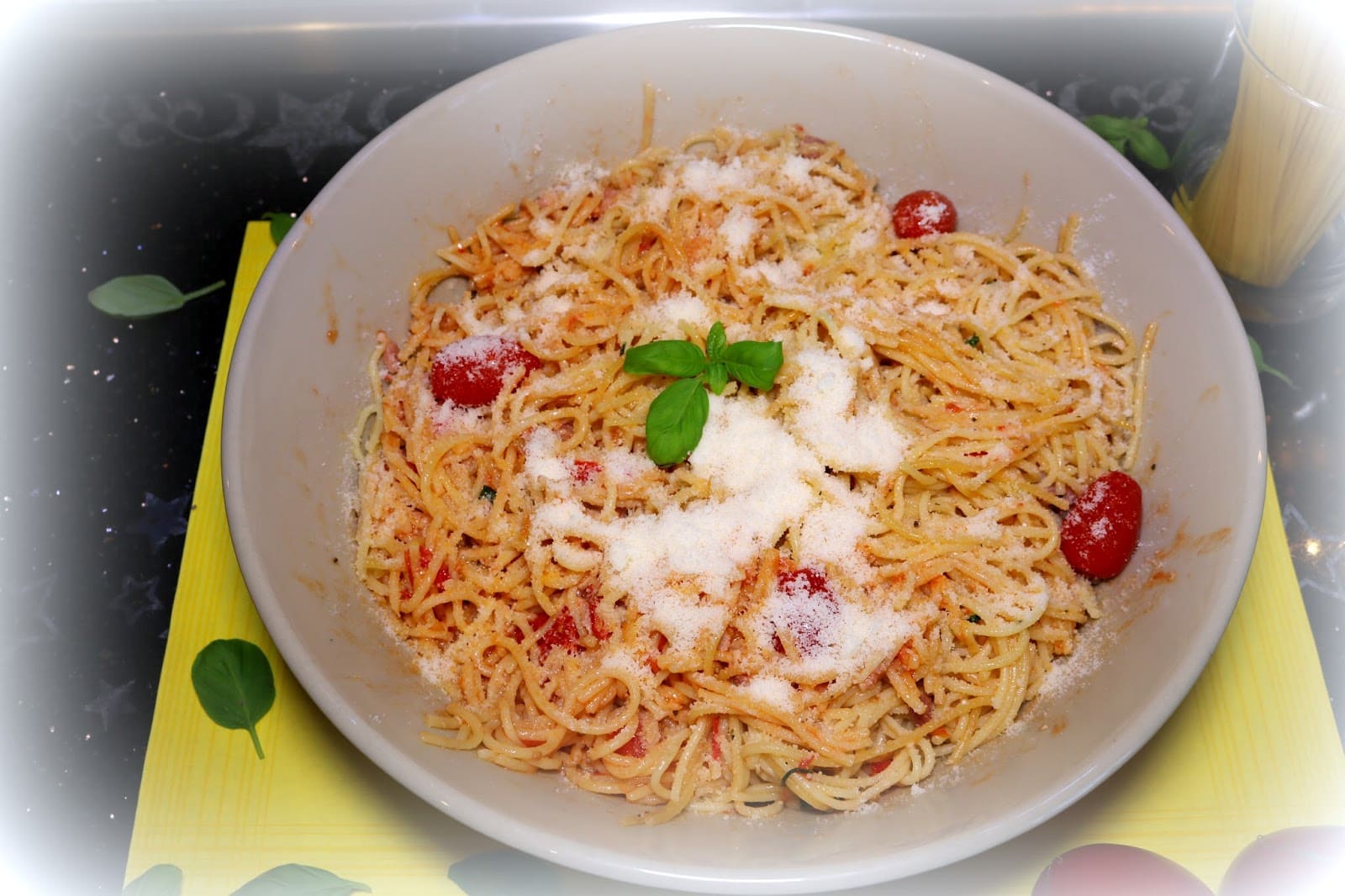 One Pot Pasta Spaghetti mit Tomate und Speck