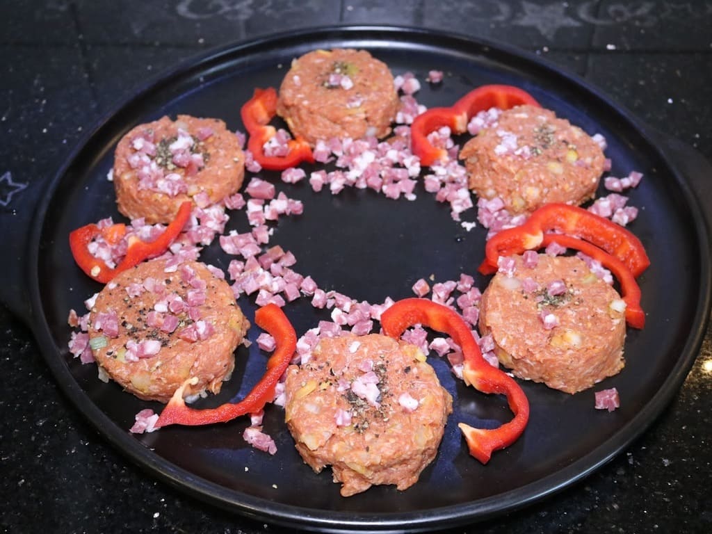 Gewürfelten Schinken und die Jägersaue über die Buletten verteilen. 3 Frühlingszwiebeln in Ringe schneiden und drüber geben.