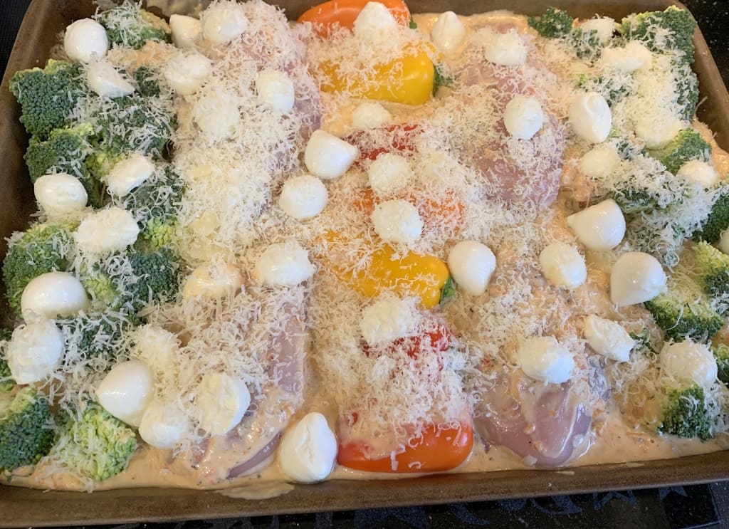 Die Mozzarellakugeln verteilen. Den restlichen Parmesan über das Gemüse und die Hähnchenbrüste geben.