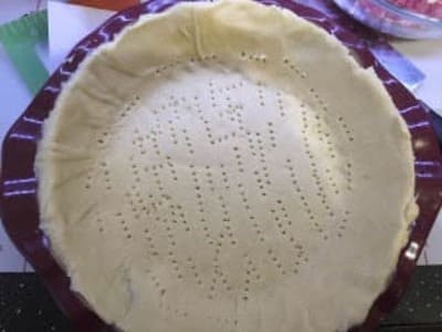 Den Teig nun in die gefettete Pieform geben und ggf. überstände mit einem Messer entfernen. Den Boden mit einer Gabel mehrmals einstechen.