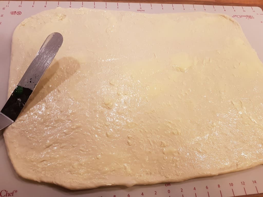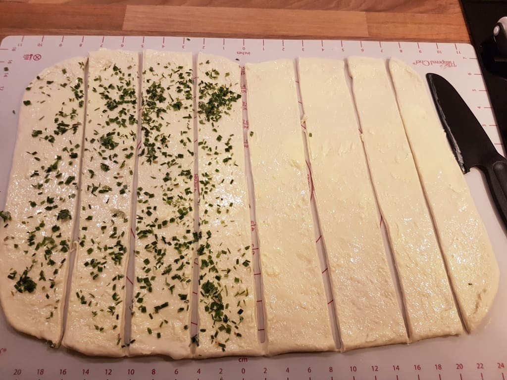 Die Butter mit Hilfe des “Alles auf einem Streich” auf den Teig streichen und die eine Hälfte mit Schnittlauch bestreuen.