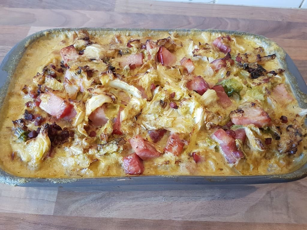 Anschliessend mit dem grob gewürfelten Kassler alles in die rechteckige Ofenhexe geben und vermengen.