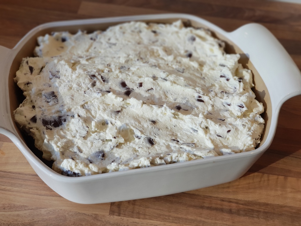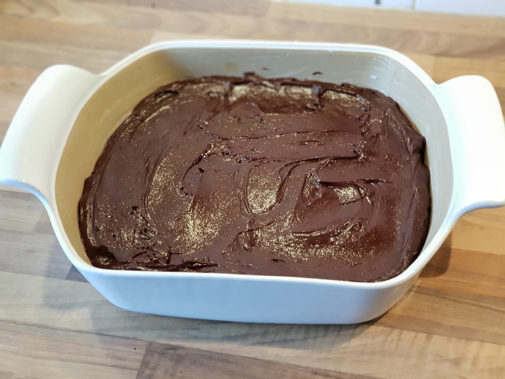 Alles in den großen Bäker umfüllen und mit einem Scraper glatt streichen.