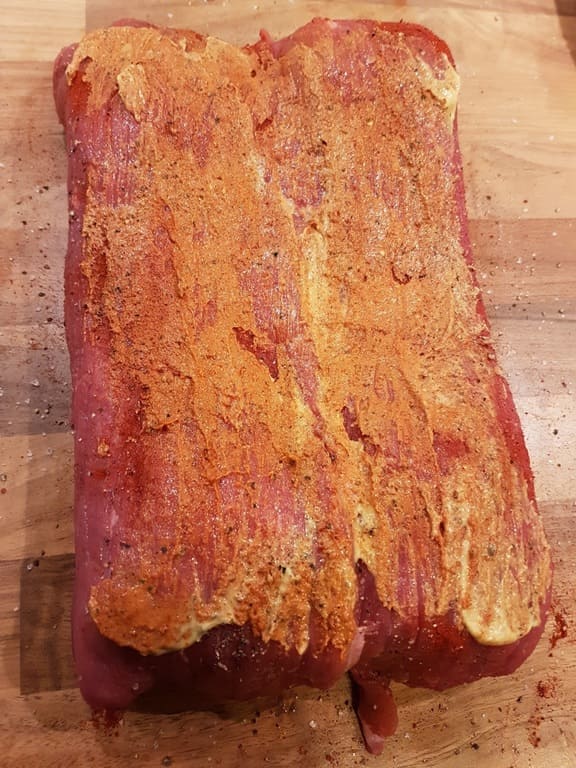 Zwei Rouladen etwas überlappend nebeneinander legen, würzen und mit Senf bestreichen.
