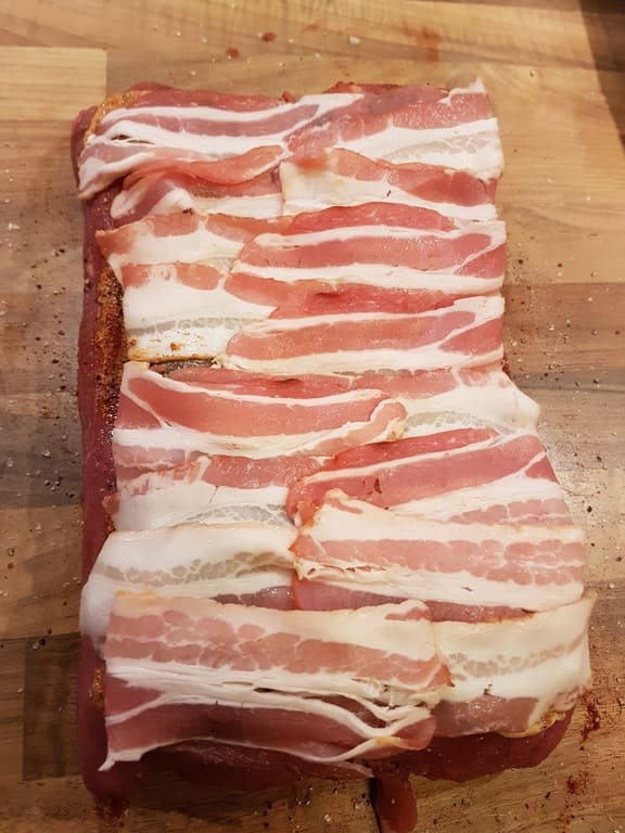 Mit Zwiebeln und Gurkenscheiben belegen den Schinkenspeck drüber legen und die Seiten von den Rouladen etwas nach innen einklappen.