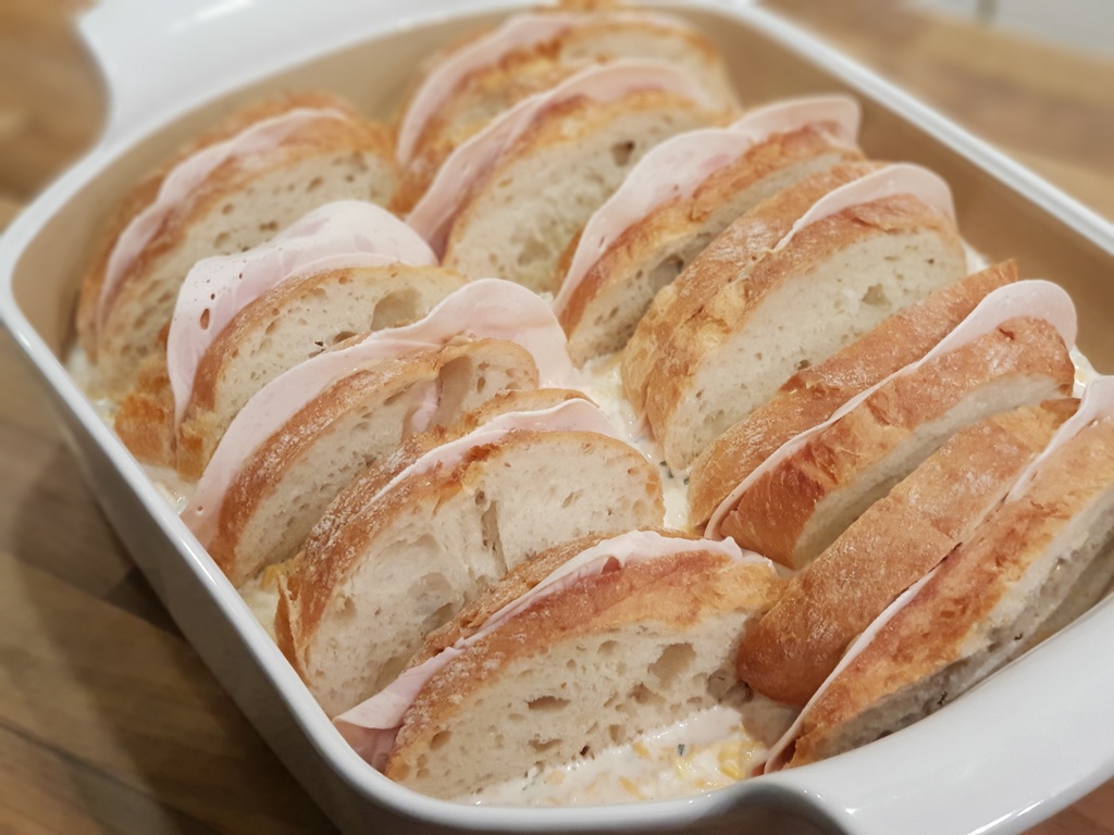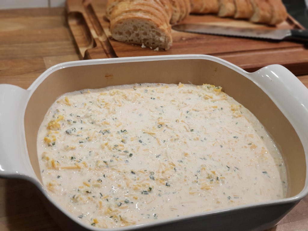 Nun die Schnitten versetzt in den Käsedip stellen.