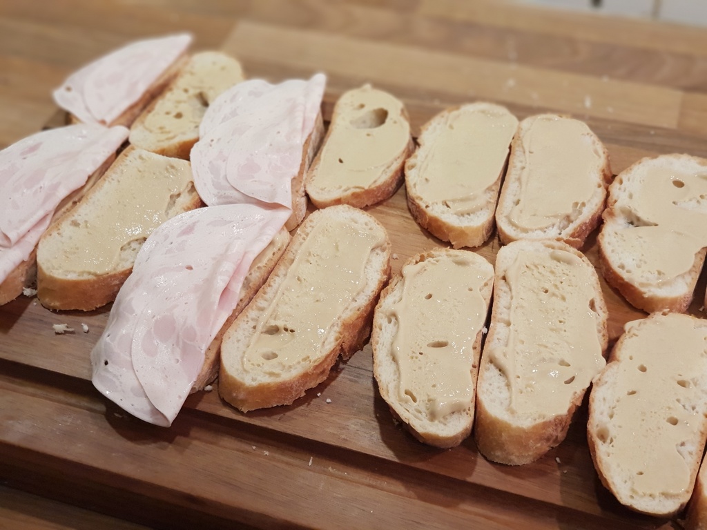 Das Ciabatta in ca 1 cm scheiben schneiden und mit Senf bestreichen.