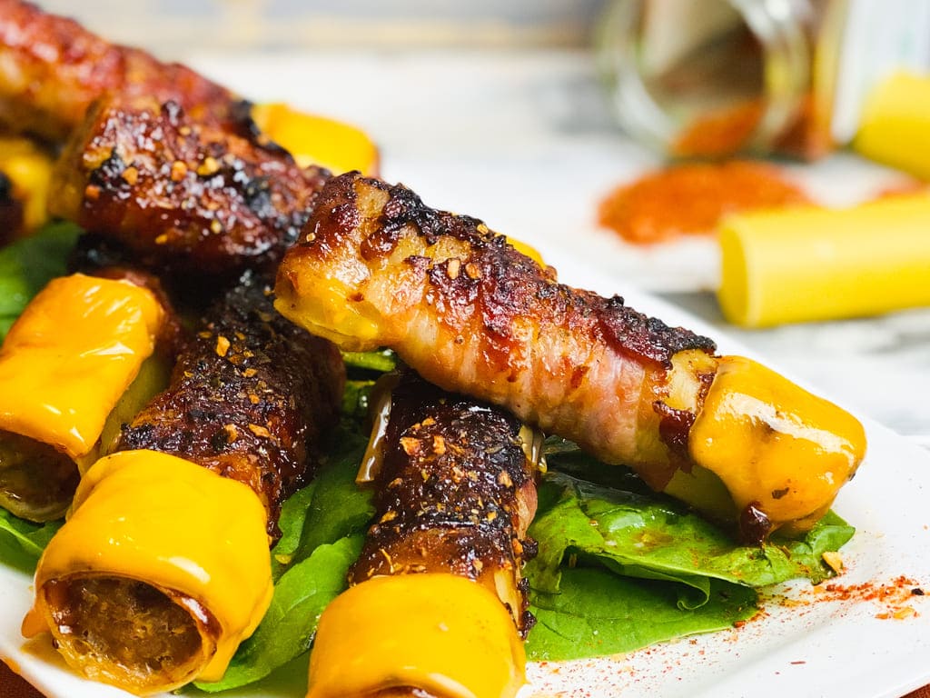 Erneut mit BBQ Sauce bestreichen, Schmelzkäsescheiben in 6 Teile schneiden und je auf das letzte drittel der Shotgun Shell legen.