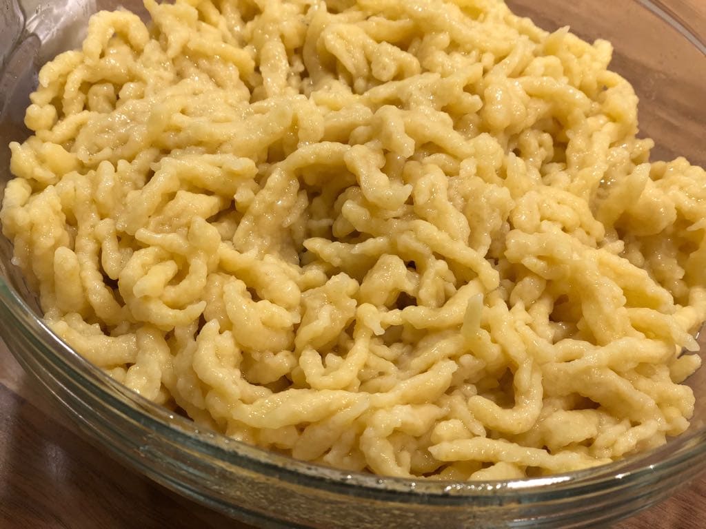 Teig in die Plätzchenpresse mit Platte Nr.10 füllen und 1/2 bis 1 Umdrehung je nach belieben der länge der Spätzle ins kochende Wasser drehen.