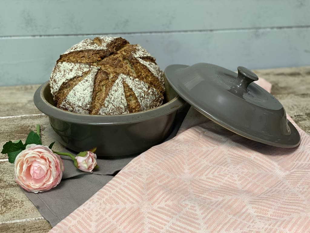 Im vorgeheizten Backofen, bei 230 Grad Ober- / Unterhitze für 55 Min mit Deckel backen.