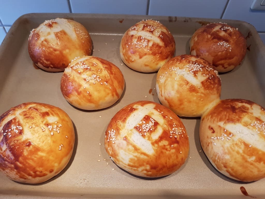 Teig in 8 Buns teilen und auf dem großen Ofenzauberer oder Zauberstein 5 Min ruhen lassen.