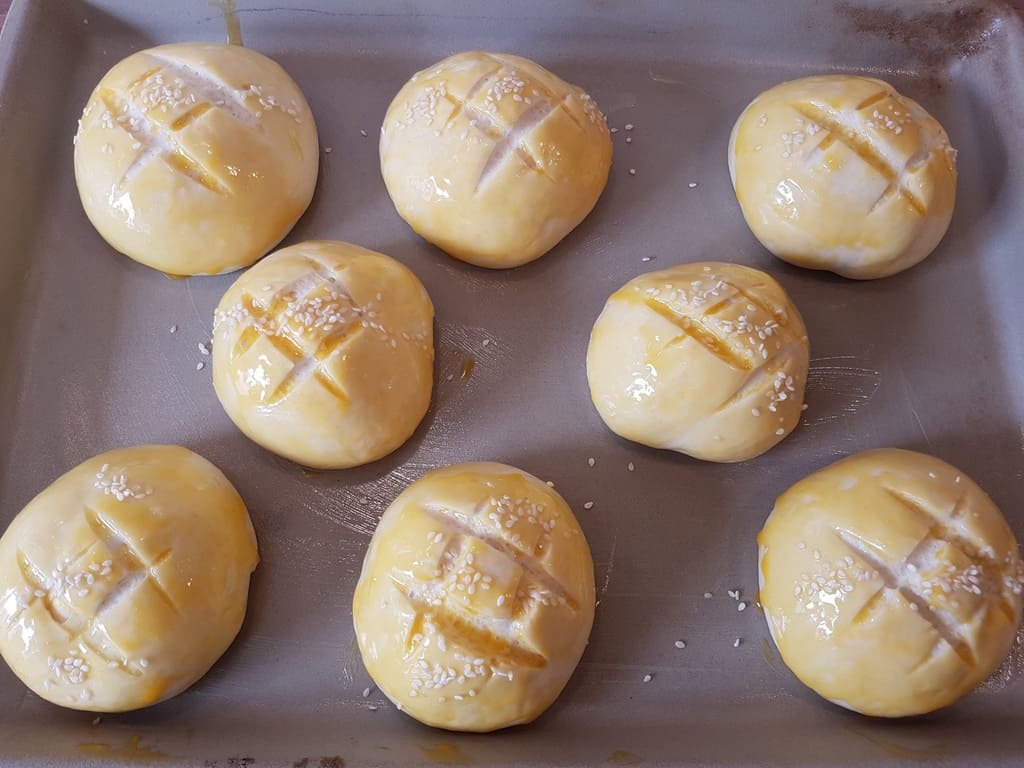 Eigelb und 1 TL Öl vermischen und die Buns damit bestreichen.